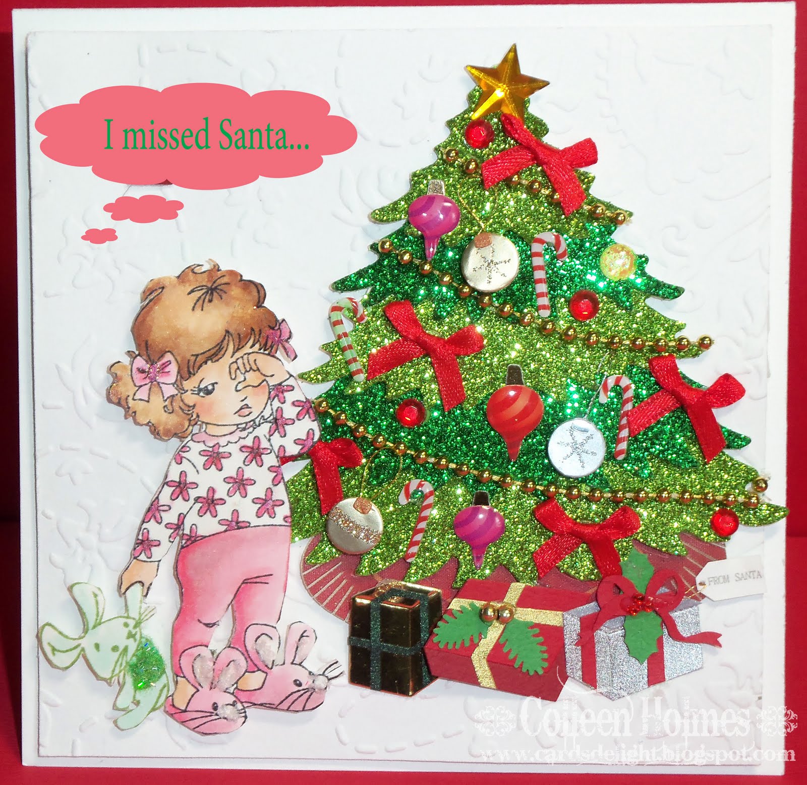 One fine Christmas, many years ago, my daughter, Amy was awoken by her older brother to come and see what Santa brought. When she saw the presents under the tree she started crying, yes crying, presents everywhere and she starts sobbing! We were like dumbfounded! Why? she was upset because she missed seeing Santa!! "All Peeked Out" instantly reminded me of the day when they still believed!